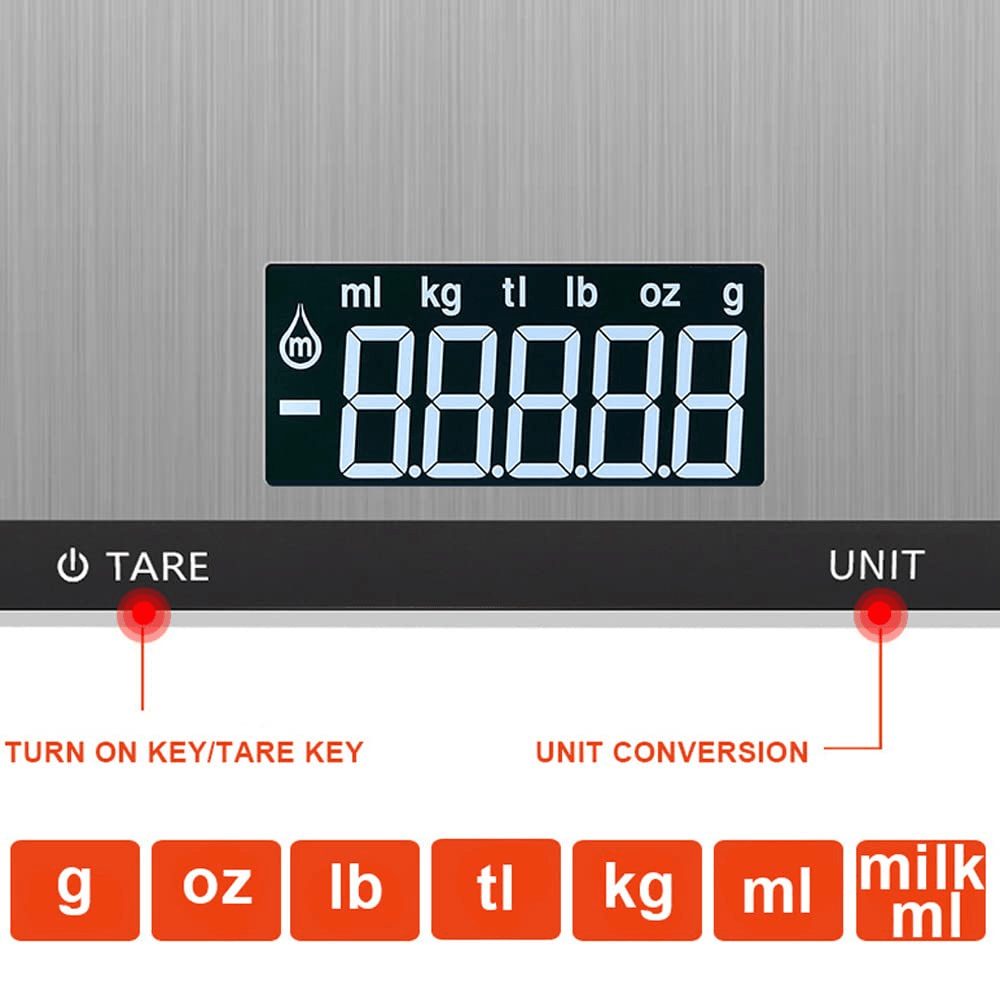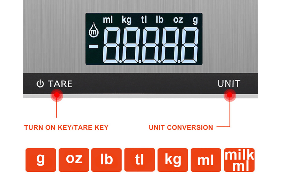 - 7 единици за измерване – (g) грамове, (oz) унции, (lb) фунт, (tl) талии, (kg) килограми, (ml) милилитри, (milk ml) милилитри за мляко.