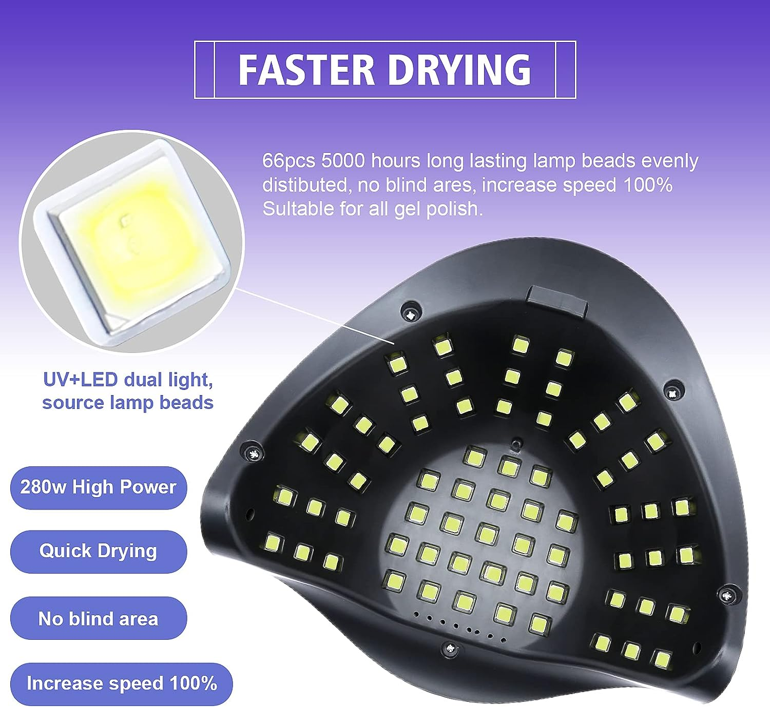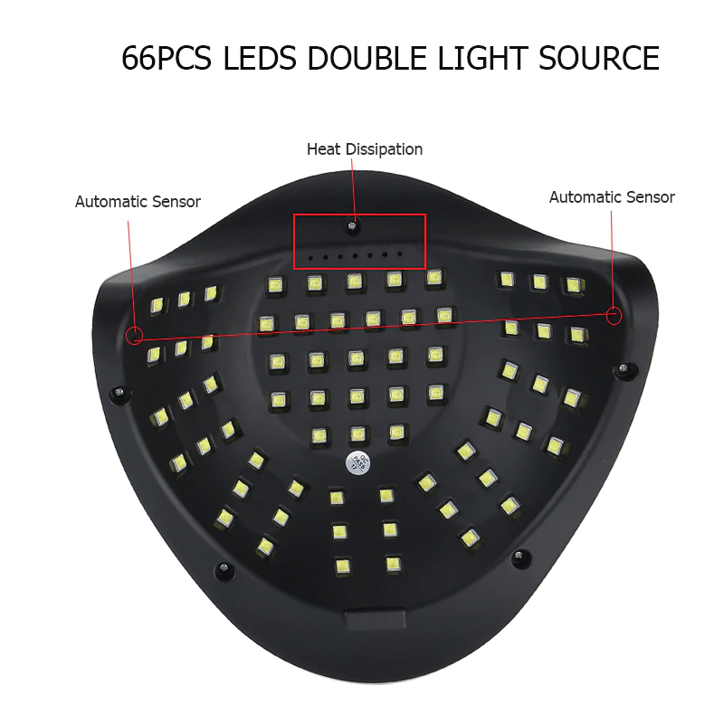 Възползвайте се от изключителната мощност от 280W и иновативното разпределение на 66 LED диоди. Това стратегическо разпределение на диодите осигурява пълно и равномерно покритие на всички части на ноктите, включително и тези по страните, без опасност от забавено съхнене или мъртва зона. Вече няма да отделяте време за изчакване, тъй като нашата лампа съкращава времето за сушене на гелове с двойно по-малко време спрямо стандартните лампи.