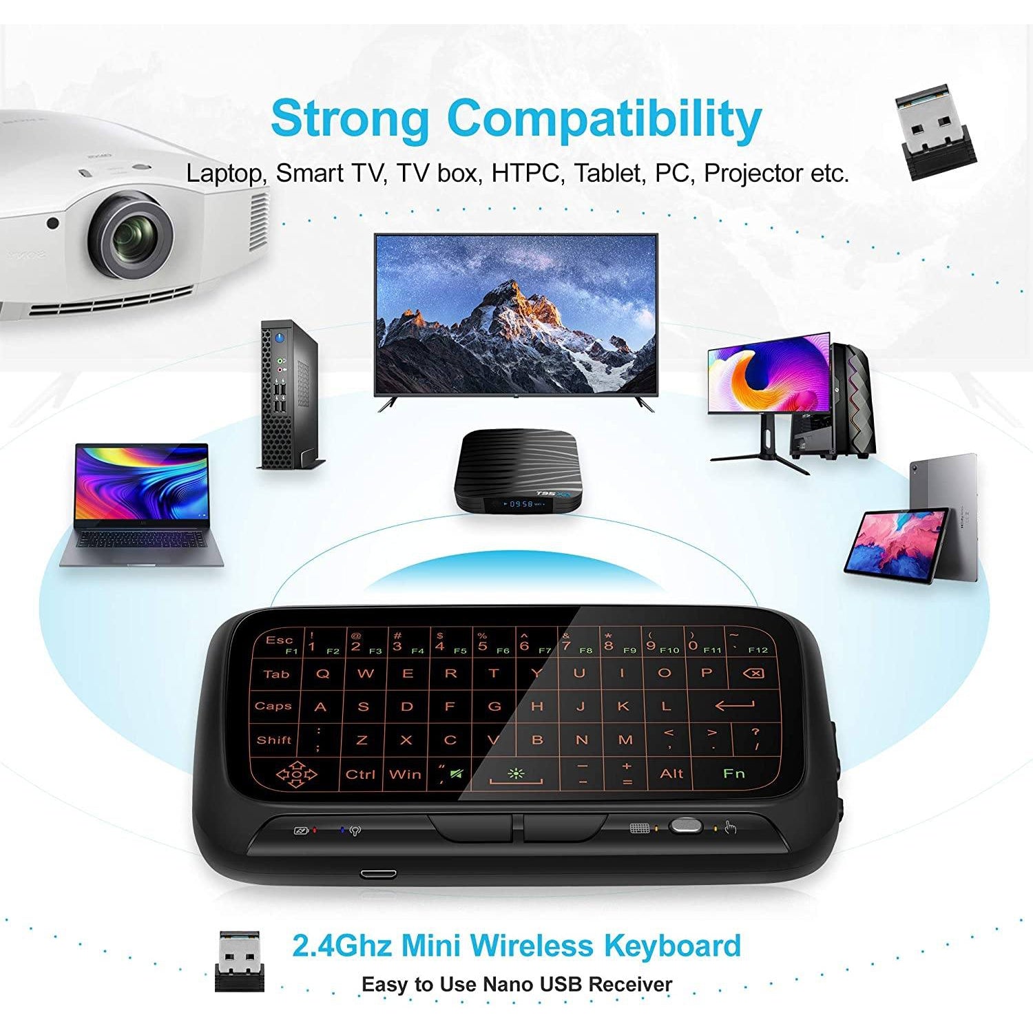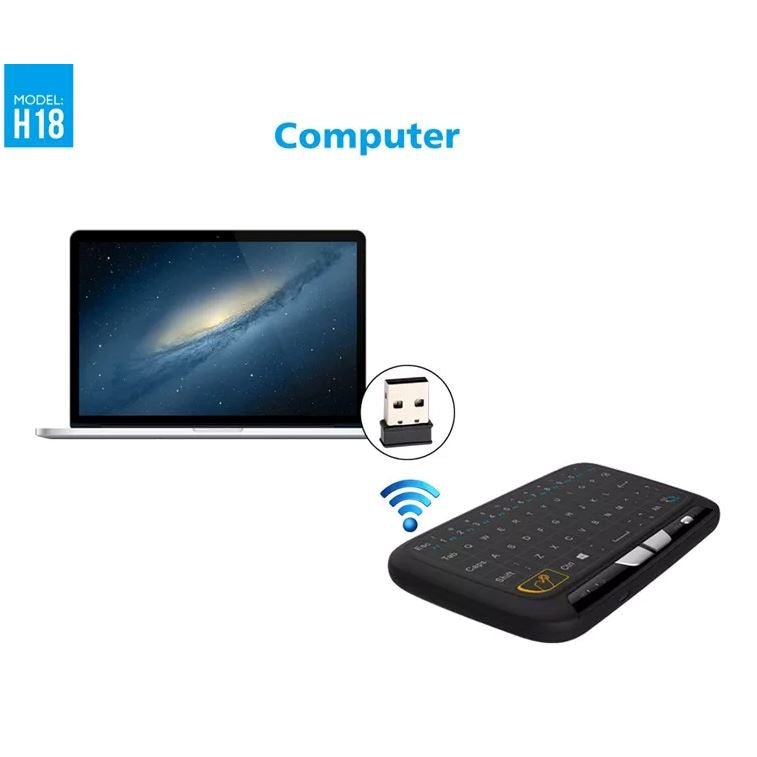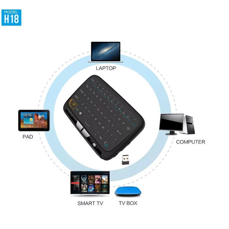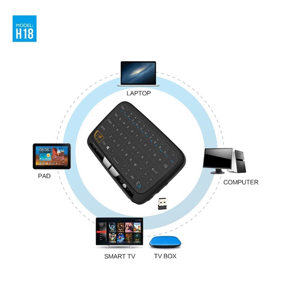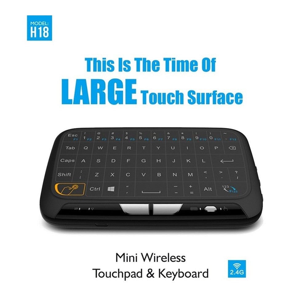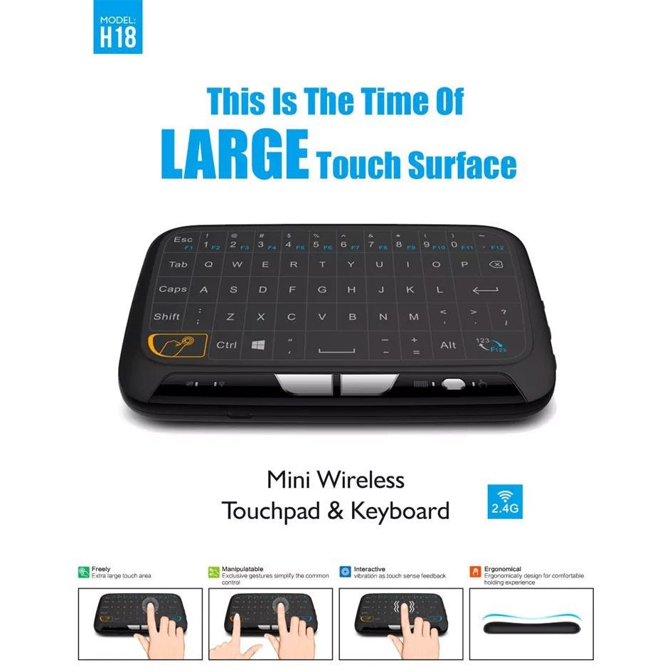 Безжичната клавиатура H18+ има функция за подсветка, която е добра за Вас да играете на тъмно, а меката й светлина няма да нарани очите ви през нощта. С 56 клавиша и 2.4GHz безжична връзка, мултитъч тъчпад и иновативно колело на мишката, тя събира клавиатура, мишка и тъчпад в едно, малкият размер включва голяма мощност. Поставете я в чантата си, удобна за използване по всяко време и навсякъде.