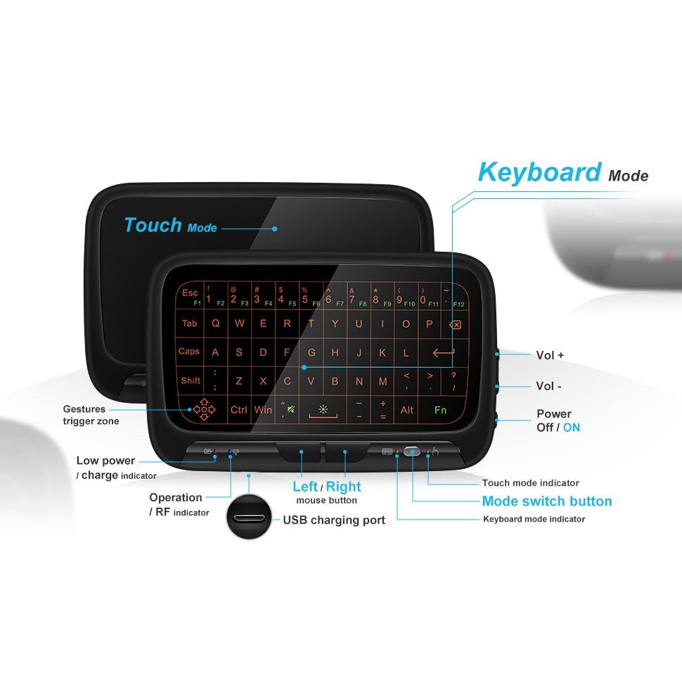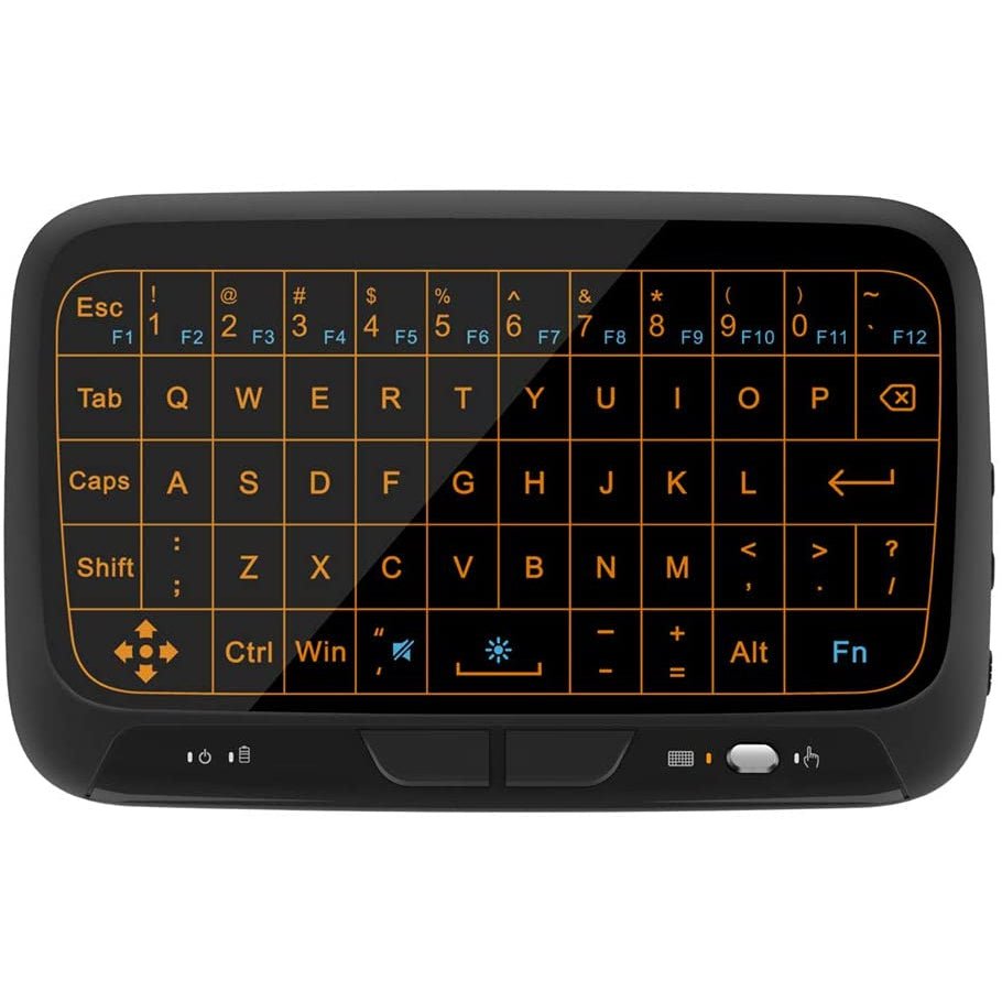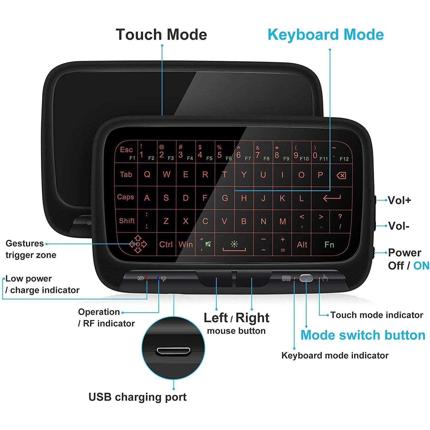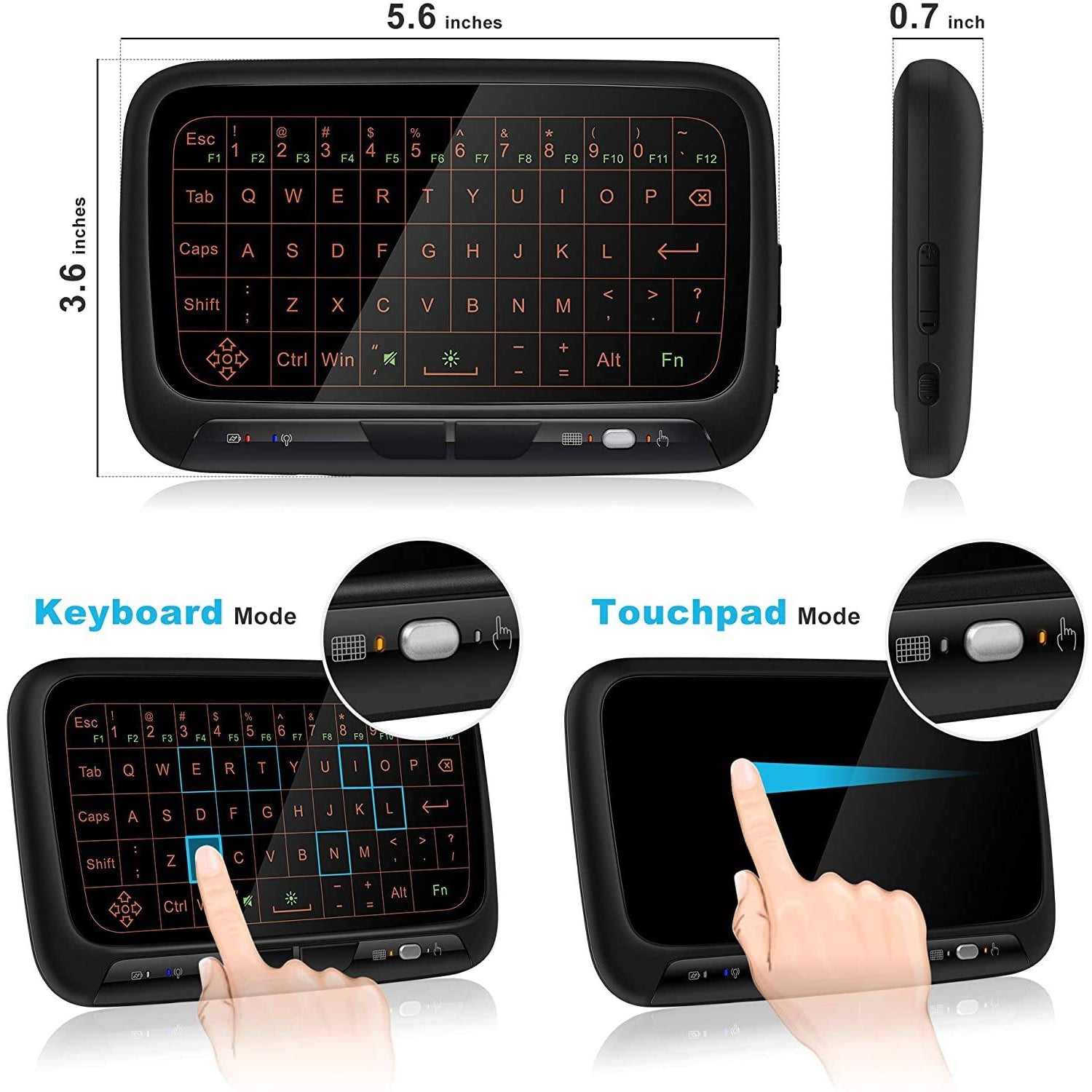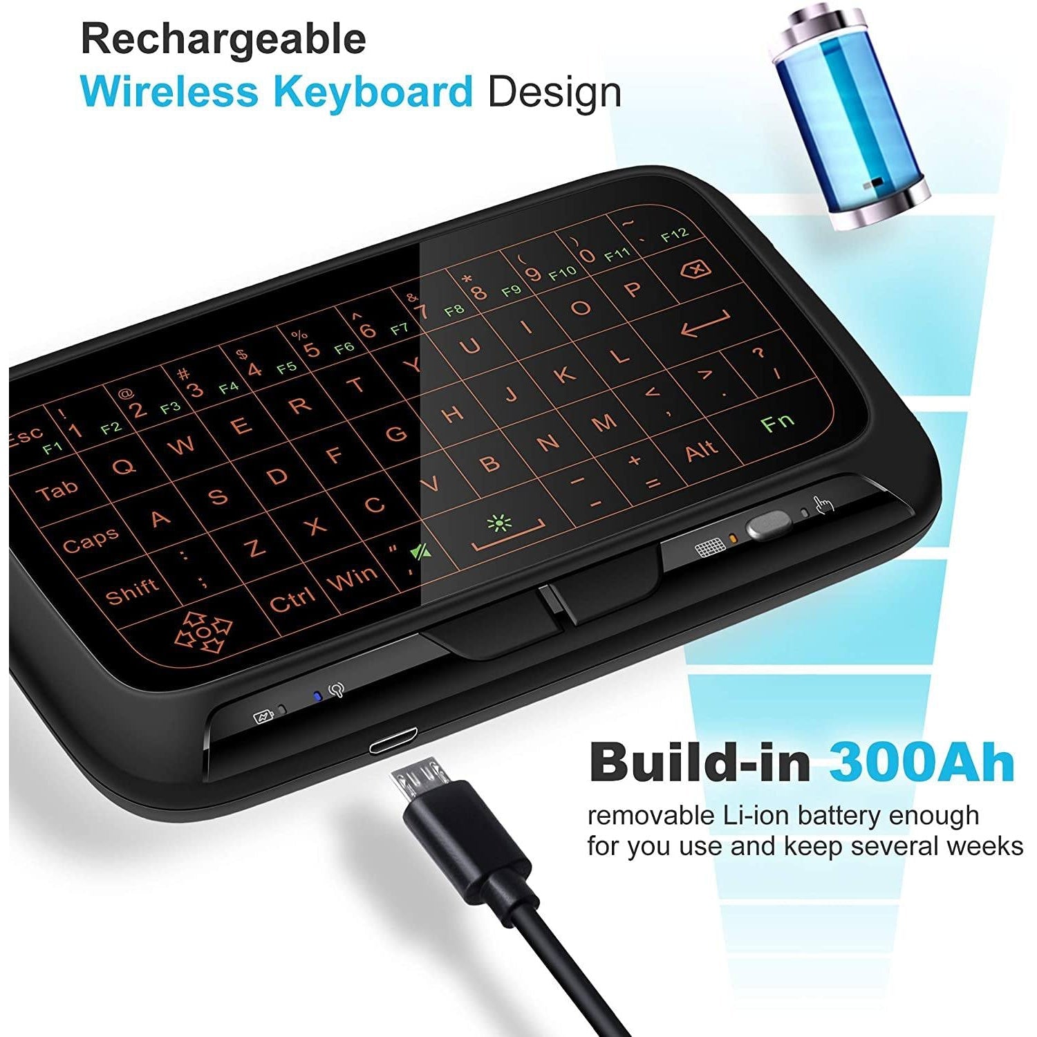 Безжичната клавиатура H18+ има функция за подсветка, която е добра за Вас да играете на тъмно, а меката й светлина няма да нарани очите ви през нощта. С 56 клавиша и 2.4GHz безжична връзка, мултитъч тъчпад и иновативно колело на мишката, тя събира клавиатура, мишка и тъчпад в едно, малкият размер включва голяма мощност. Поставете я в чантата си, удобна за използване по всяко време и навсякъде.