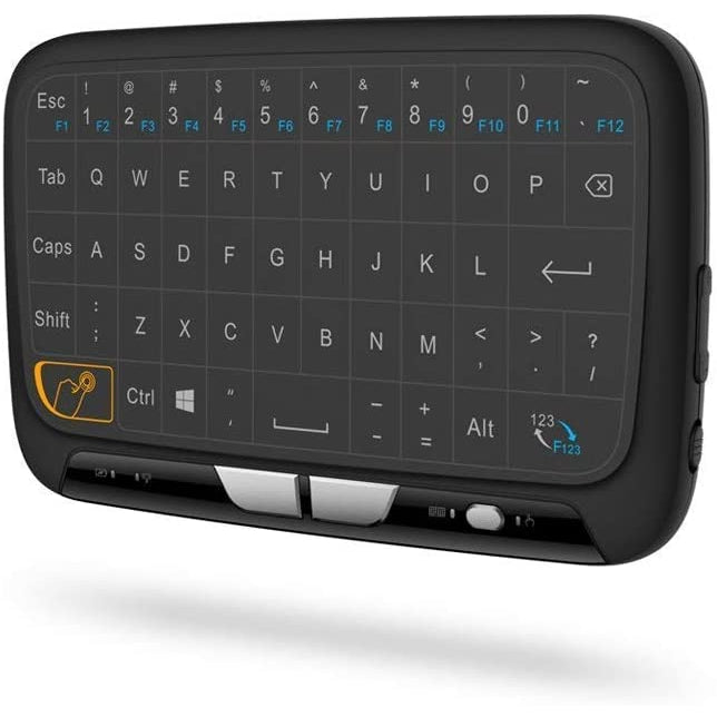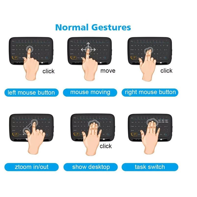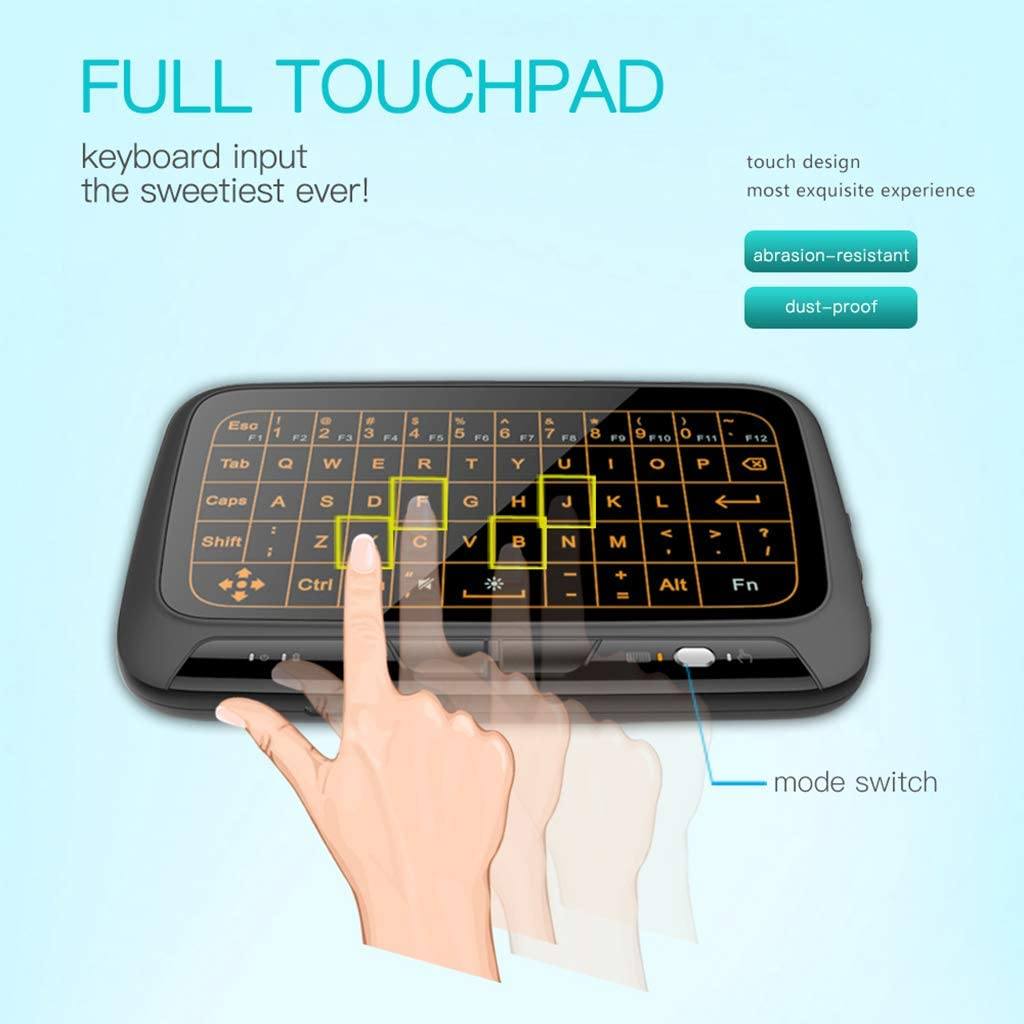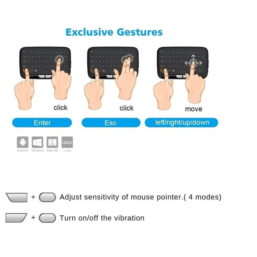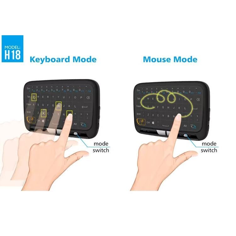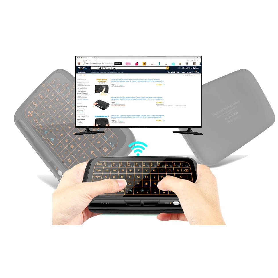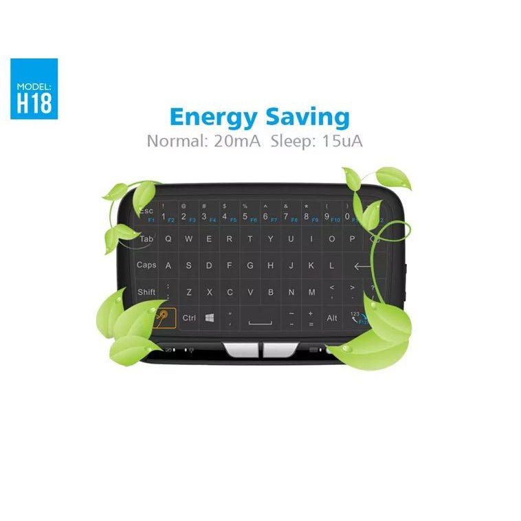 Безжичната клавиатура H18+ има функция за подсветка, която е добра за Вас да играете на тъмно, а меката й светлина няма да нарани очите ви през нощта. С 56 клавиша и 2.4GHz безжична връзка, мултитъч тъчпад и иновативно колело на мишката, тя събира клавиатура, мишка и тъчпад в едно, малкият размер включва голяма мощност. Поставете я в чантата си, удобна за използване по всяко време и навсякъде.