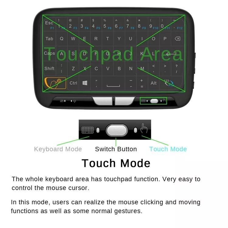 Тази безжична клавиатура има 2 режима, режим на тъчпада и режим на клавиатура. Можете да го използвате като тъчпад или клавиатура по всяко време с бутона за превключване на режима.