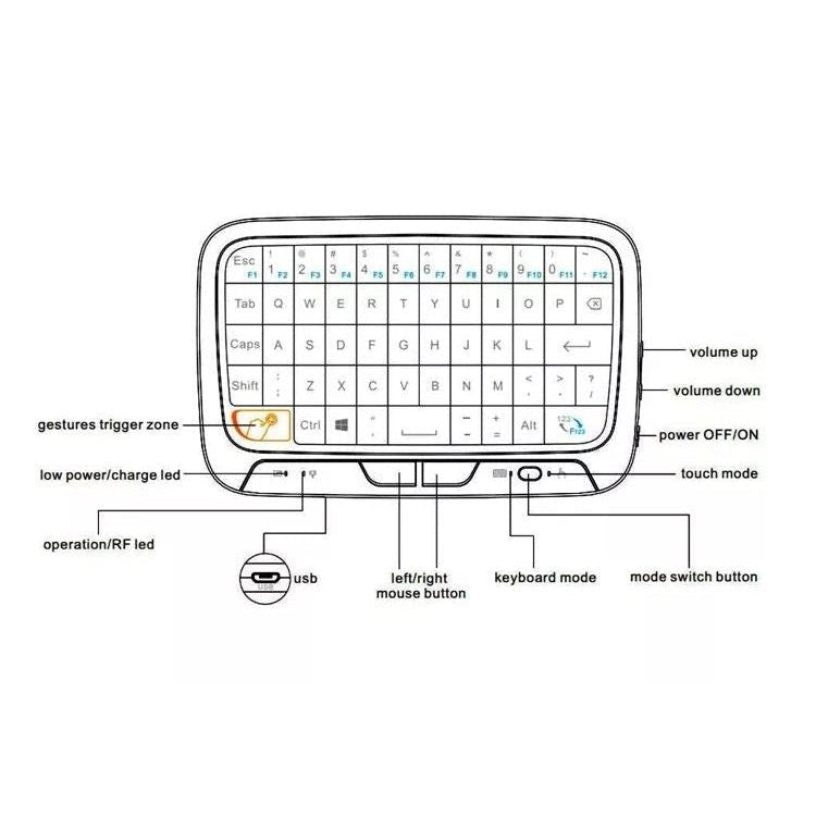 Мини клавиатура: Нов дизайн с два режима (режим на докосване и режим на клавиатура). Цялата област на клавиатурата има функция тъчпад. Високочувствителен тъчпад на целия панел с функция на мишката, включително движение на мишката, ляв бутон на мишката, десен бутон на мишката и колело за превъртане на мишката.